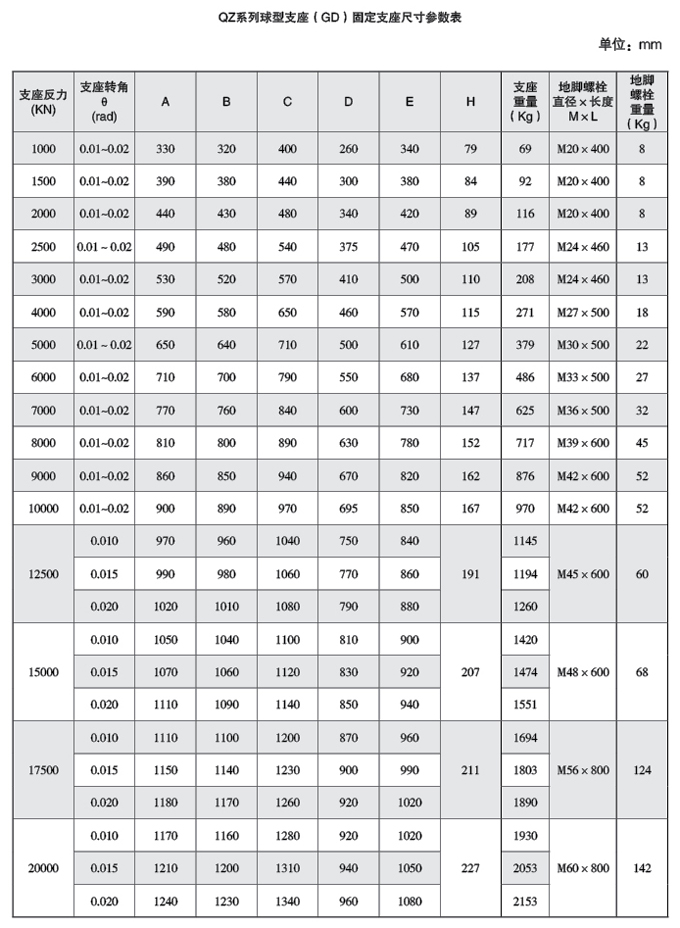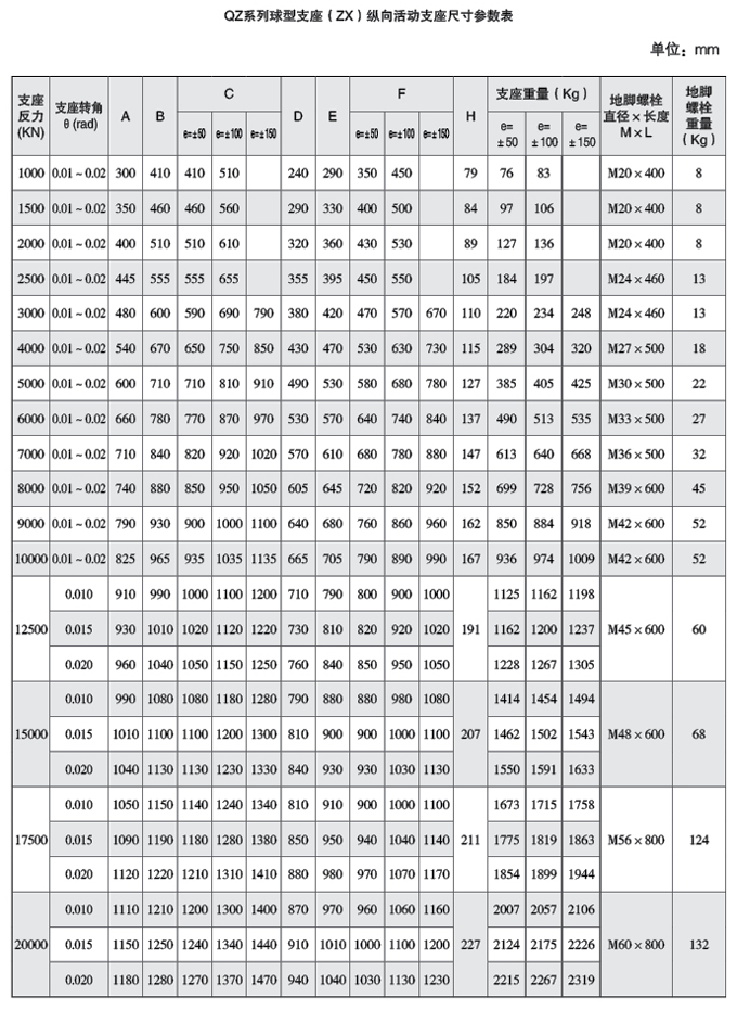 3、QZ系列球型支座的主要技術(shù)性能: a、支座反力(豎向承載力)分為 16級(jí):1000、1500、2000、2500、3000、4000、5000、6000、7000、 8000、 9000和10000、 12500、 15000、 17500、 20000KN。