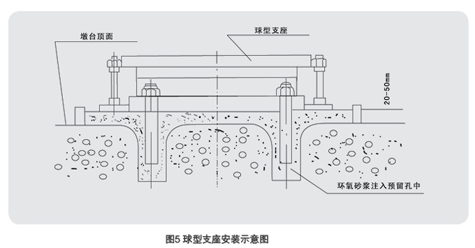 a安裝支座板及地腳螵栓:在下支座板四角用鋼楔塊調(diào)整支座水平,并使下支座板底面髙出橋嫌頂面20 50mm,找正支座縱、橫中線的位置,使之符合設(shè)計要求。用環(huán)氣樹脂砂漿灌注地腳嫌栓孔及支座底面墊層。 (圖5 )