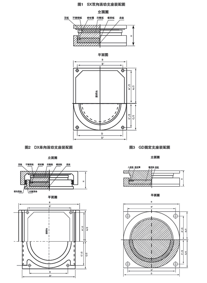雙向(多向)活動支座和單向活動支座由上座板(包括頂板和不銹鋼滑板)、聚四氟乙烯滑板、中間鋼 板、密封圈、橡膠板、底盆、地細燦栓和防塵罩等組成,單項活動支座沿活動方向還設有導向擋塊。